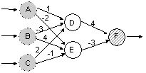A neural network is composed of nodes and the number of input, hidden and output nodes is called the network topology. In our example, the input nodes are the independent variables (price, children, duration) and the output node is the destination. Intermediate results leading to the final output are stored in what is defined as hidden nodes because the user is only aware of the input and the output of the neural network. The algorithm computes a weighted sum based on the input variables at each node and returns an output. The weight applied to each input and the number of hidden nodes are established by separate algorithms. For our example, we will label the input nodes as A (price), B (children) and C (duration), use 2 hidden nodes (labeled D and E) and label the output node as F (destination), see Figure 3.