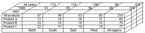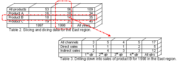 Even though the OLAP structure is multidimensional, our computer screens limit us to presentations in two dimensions. To navigate through the OLAP structure with the tools that we have, we slice and dice through the data. Basically, what this means is since we cannot visualize all the data at once, we will extract a piece of it from the structure, analyze that part and if that chunk is still too large to comprehend, dice it into even smaller pieces, see Table 2. Once we have isolated an area of interest, for instance Table 2 shows that sales of product B are declining in the East region, we want to extend our analysis and retrieve additional information pertaining to this focal point, this is called "drilling down" (see Table 3).