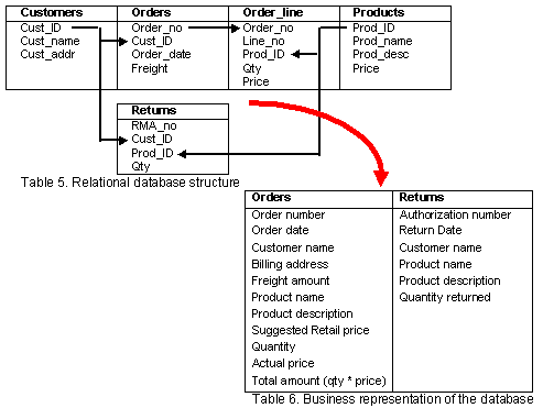 The reason for those incorrect results is that those tools do not understand semantics and request information that cannot be properly interpreted in one SQL statement. The relationships between the tables in this example, illustrated by the arrows in Table 5 can be interpreted as the five following sentences: "A customer can place many orders", "An order can contain multiple lines of detail, one for each product ordered", "A customer can obtain many return authorizations", "A product can be ordered many times" and "A product can be returned many times".