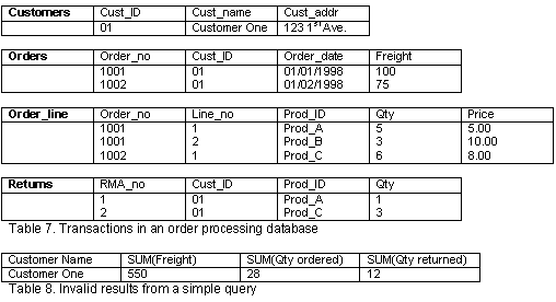 Let’s build a simple example that will illustrate two of those semantic problems within one single query. We want to build a query that will show us the total amount spent for freight and the total quantity of items ordered vs. returned for each of our customers using the data contained in Table 7. As unbelievable as it may seem, the vast majority of query tools currently available on the market will return the results displayed in Table 8.