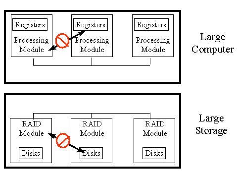 Inside large computers or inside large storage subsystems there are multiple modules. In the case of the large computer, one module does not have access to internal registers in another module.