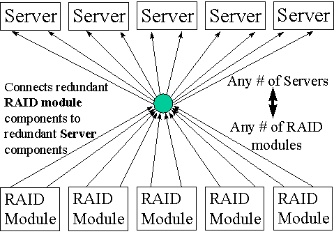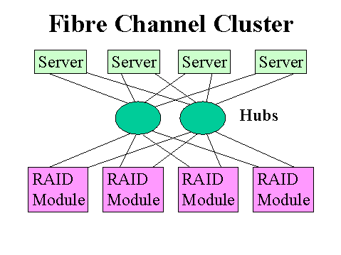 Leveraging outside-the-box connectivity, Fibre Channel allows standard RAID arrays to be used as the RAID modules and standard hubs to be used for many-to-many connectivity. This dramatically reduces the purchase cost of the storage and the connectivity.