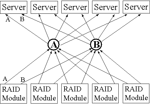 For high availability environments, each RAID array must be fully redundant, including two controllers, A and B. Each server should have two HBAs, A and B, so that no one HBA failure can cut the server off from the data. Use at least two hubs per cluster, A and B. Connect all the HBA A’s and RAID controller A’s to hub A. Connect all the HBA B’s and RAID controller B’s to hub B.