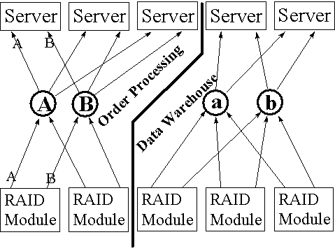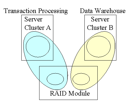 Because the "inside-the-box" solution keeps the clusters completely isolated, there is no danger that peak performance demands from the application on one cluster, such as for data warehousing, will take away from the performance necessary on the other cluster, such as for online transaction processing.
