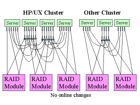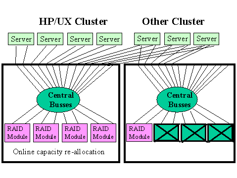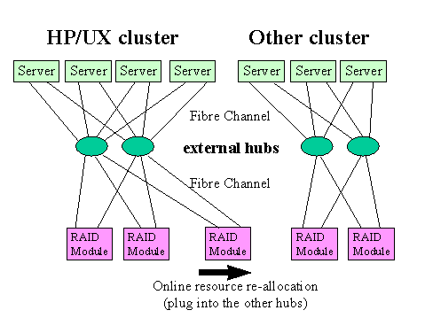 Re-allocate entire disk arrays between clusters by unplugging from one hub and plugging into another. This was not possible online with SCSI.