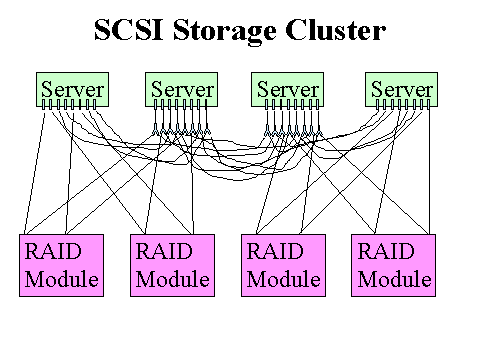 The example is a four-node cluster sharing four standard RAID arrays. For availability, each RAID array must have two separate paths to each server. To take advantage of the RAID array performance, each RAID array must have at least 50 MB/sec of bandwidth to the servers while the other RAID arrays are working equally hard . This is accomplished by giving each RAID module a pair of UltraSCSI connections to all the servers, which is not shared with any of the other RAID arrays. Since there are four RAID arrays, there are four pairs of UltraSCSI connections, so each server must have eight HBAs.