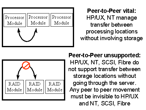 At the 50,000 foot overview level, it would appear that having multiple RAID modules linked together inside a subsystem would allow more efficient interaction between RAID modules, just as multi-processor computers have highly efficient communication between processing modules. However, the opportunities for peer-to-peer interactions between RAID modules are limited.