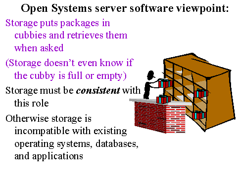 The software layers on the server (such as volume managers, file systems, operating systems, databases, and applications) expect storage to simply store and retrieve blocks without performing any other function. Storage must never do anything that catches the software by surprise. Examples of common functions that safely can be carried out internal to the storage include making extra copies or snap shots. However, the importance of internal connectivity for these function is limited by the fact that the same functions can be accomplished using inexpensive server software and trivial amounts of server resources.
