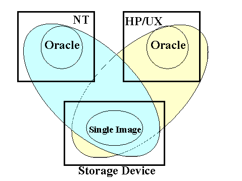 To our knowledge, neither Oracle nor any other database supports byte sharing between two different operating system platforms, such as the example shown at the left.