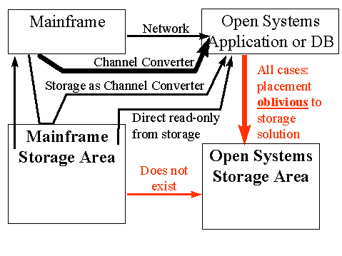 Also, it should be noted that storage-independent transfer methods are both faster and less expensive than proprietary tools using inside-the-box connectivity. These storage-independent tools use special adapters to use mainframe IO channels to get data off the mainframe and feed it to the open systems SERVER at very high speed. Examples: 1) CNT FileSpeed: 30+ GB/hour, jointly marketed by CNT and IBM 2) StorageTek Network Executive: 20+ GB/hour, over 3000 copies installed.