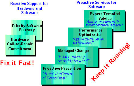To achieve a high level of availability, HPs experience in the UNIX environment has determined the need for a strong set of specific services and support products. There are in fact two categories where we can classify those. The "Keep it running" category that consists in all the preventive aspects of service and support and the "Fix it Fast" category that encompasses the reactive aspect.