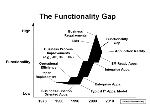 The chasm in question is what the GartnerGroup calls the Functionality Gap. Since the beginning of time, applications have been developed in the domain of computer languages and programming code. As applications added more functionality, the amount of code increased. With the move toward distributed processing and enterprise level functionality, the amount of code increased at an even greater rate. The result, as depicted by the plot on the right in the diagram above has been a gradually flattening curve. As more code (and the time to program, compile and test it) is added, the curve moves farther to the right. Given enough time, it will die of its own weight.
