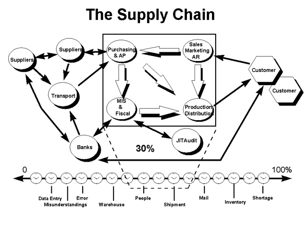 The successful search for an interoperable solution starts before the replacement technologies are conceived, designed, installed, and locked into place. It begins with an examination of the entire trading cycle as it is today. The cycle begins with the a customer’s order. The manufacturer passes the order through the usual intra-enterprise activities -- sales, marketing, manufacturing, distribution, purchasing, accounting (fiscal), and systems (MIS). Since this is the age of distributed manufacturing -- we do not want to make things that others can make better, cheaper-- the manufacturer turns to outside support (inter-enterprise activities) from suppliers, utilities, transportation, banking, communications, government, and other providers of goods and services that are needed to make the product. The combination of the ‘intra’ and the ‘inter’ defines the length and breadth of the supply chain from the customer’s customer to the supplier’s suppliers. When measured with a timeline, it also defines the total cost of the finished product.
