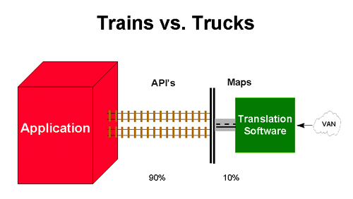 In a data processing environment, information (data) on ‘trucks’ can go anywhere in the system. New information only requires new instructions, and new messages. Information on ‘trains’ can only go where the programs (tracks) ‘say’ it can go. Thus, new destinations require new ‘tracks’ and the new programming, coding, compiling, and testing that comes with it. The concept is easy to understand when presented to scale. Messaging (trucks run on highways) takes about 10% of the ‘integration’ effort. API’s (trains), on the other hand, run on tracks (program code) which comprises about 90% or the ‘integration’ effort.