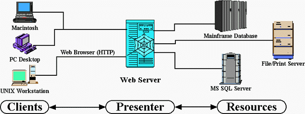 Business computing has moved through several stages in past decades. Computing technology was first taken seriously with the development of large central mainframes that were responsible for all processing of data and "dumb terminals" that served as little more than a client interface. As the "personal computer" became more commonplace and more powerful, increased data processing responsibilities were moved to the client side. Today, a balance between these methods is most common that is, clients are responsible for some data processing. Dedicated servers share the remainder of the load. The term three-tier" architecture refers to 1) The clients, 2) A "presenter" which retrieves and formats data for the clients, and 3) Data storage/resource machines. By using a web server as the "presenter", the system can be client-type independent. Figure 1 illustrates a basic web-based three-tier client-server model. The benefits to this model include the fact that the web server is responsible for creating and maintaining all connections to the database, and that the "back-end" system may be any type of data source.