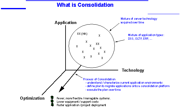 What is Server Consolidation? Whether stated as "Host Recentralization", "Operational Consolidation", "Server Consolidation", or simply "Consolidation" -- these terms are getting a lot of use in many large IT organizations, and may be interpreted to mean different things. Some use Server Consolidation to refer to the process of migrating a given workload from a large number of low to midrange servers to a small number of high-end servers. More broadly defined, the term also refers to the process of streamlining and re-architecting a data center infrastructure and operational processes in order to achieve a more efficient and cost-effective data center. When we refer to Server Consolidation, we have this broader definition in mind. A more accurate phrase that better captures this definition is Data Center Optimization, of which the consolidation of servers is merely one of many possible tactical approaches.