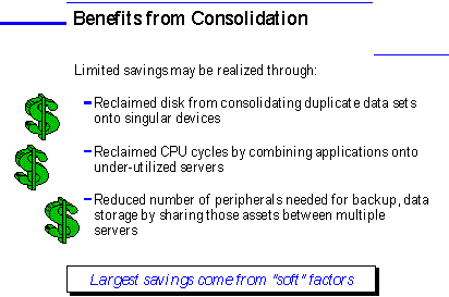 The benefits from Consolidation come from several factors, which may be categorized into both reductions in hardware costs (fewer server and mass storage units to support a given workload), and from reductions in management and support costs ("soft factors").
