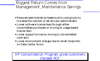 This presentation will describe HP's consolidation architecture, as well as describe the different types and aspects of Consolidation. It will also discuss the benefits of Consolidation and how to realize them.