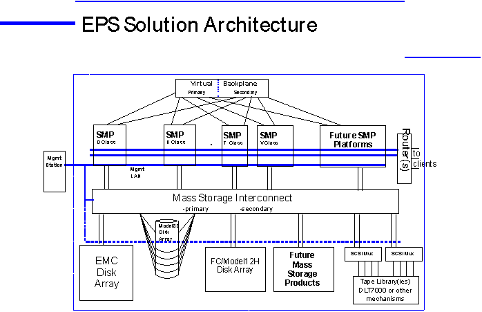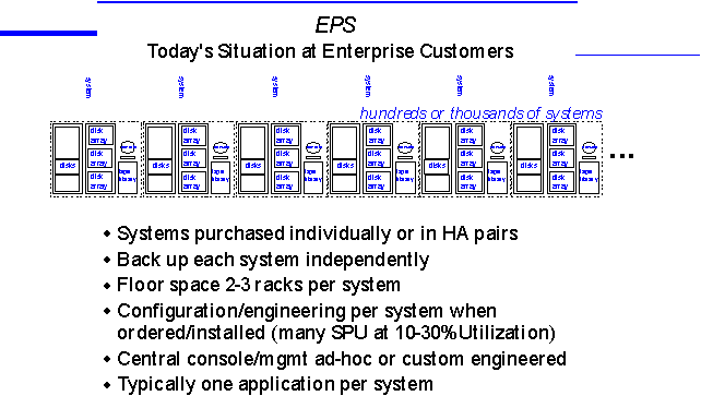 For Mass Storage Consolidation, the key enabling technology in EPS is the FibreChannel Arbitrated Loop (FCAL) mass storage interconnect. With FibreChannel as the mass storage interconnect (Storage Area Network, or SAN), mass storage devices such as large disk arrays can serve multiple systems, not just one. Also, by having the large mass storage shared across multiple systems, the result is a free pool of storage for the entire data center, as opposed to administrators having to manage storage space on a per application or per system basis. Another advantage of FCAL over other interconnect technologies such as SCSI cables is that storage can be easily moved between systems without having to re-cable. Also, additional systems can be added to a shared mass storage configuration with less effort than in the storage-per-system approach.