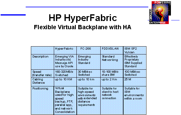 One of the key enabling technologies for a Consolidated computing environment is a high-bandwidth interconnect for inter-node communications and running backups over a network. The following table compares the performance characteristics of HP’s HyperFabric, which forms the basis of the Virtual Backplane in an EPS configuration. Note that the bandwidth of the HyperFabric switch is substantially higher than that of other alternatives, which includes both standards-based as well as proprietary networking technologies. The HyperFabric interconnect enables parallel DSS, parallel OLTP, and multi-tier message-passing applications, such as large ERP applications, to have excellent performance by virtually eliminating networking as a source of potential bottlenecks. It also makes network backups practical, as it can sustain sufficient bandwidth to keep tape backup devices streaming.
