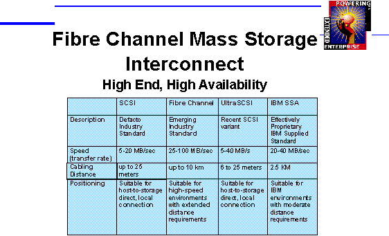 The following table compares the performance characteristics of the FiberChannel Arbitrated Loop (FCAL) mass storage interconnect, and compares it to SCSI as well as other proprietary mass storage interconnect technologies. FibreChannel as a mass storage interconnect provides substantially higher I/O bandwidth and cabling distances than any of the other technologies, and also allows for a substantial increase in the number of systems and mass storage devices that can be connected, with the addition of FiberChannel hubs.