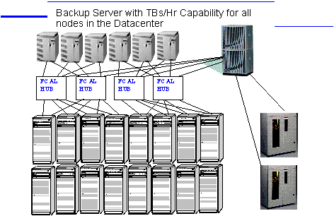 The figure above illustrates a large scale mass storage configuration connected to multiple nodes through FCAL hubs, with a large shared backup server interconnected to all the nodes through the Virtual Backplane.