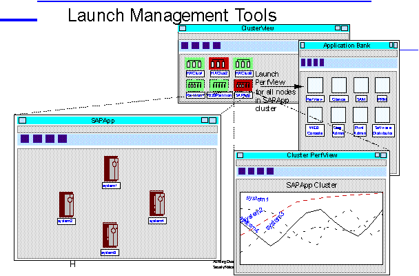 In an EPS cluster, ClusterView Plus provides the basis for a centralized management station which provides one management console for multiple systems. With ClusterView Plus, an administrator can create Management Clusters, which are a user-defined grouping of nodes. Once management clusters are defined, an administrator can monitor the status of those nodes, and can launch system management tools to apply monitoring or administrative tasks across a set of nodes. For example, it is possible to launch PerfView on a set of nodes in a Management Cluster, as illustrated by the figure below.
