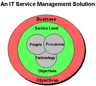 As can be seen the components are inextricably linked and highly interdependent. The driving forces behind the ITSM solution are the Business Objectives, with the last consideration being the technology management issues. This is a key point when justifying the establishment of an ITSM solution.