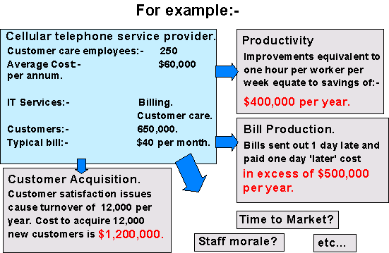 This example can also be turned around. An extra $100,000 invested in the IT organisation and effectively spent on improving IT Service Delivery will result in improved IT Service availability, end users better able to service their customers, improved customer satisfaction and an improved market image for the company. The increased retention rate for existing customers coupled with an improved ability to acquire new customers will provide benefits that exceed the initial expenditure. In addition the increased control which the IT Organisation has of the IT Services will result in less reactive support and allow more time to be focussed on proactively addressing the needs of the business with new and improved IT Services. This will result in additional competitive improvements.