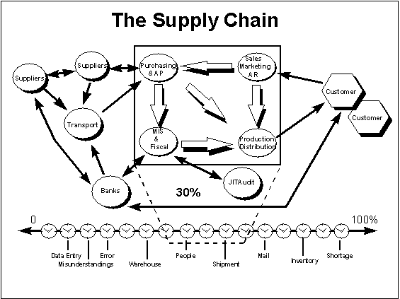 The successful search for an interoperable solution starts before the replacement technologies are conceived, designed, installed, and locked into place. It begins with an examination of the entire trading cycle as it is today. The cycle begins with the a customer’s order. The manufacturer passes the order through the usual intra-enterprise activities -- sales, marketing, manufacturing, distribution, purchasing, accounting (fiscal), and systems (MIS). Since this is the age of distributed manufacturing -- we do not want to make things that others can make better, cheaper-- the manufacturer turns to outside support (inter-enterprise activities) from suppliers, utilities, transportation, banking, communications, government, and other providers of goods and services that are needed to make the product. The combination of the ‘intra’ and the ‘inter’ defines the length and breadth of the supply chain from the customer’s customer to the supplier’s suppliers. When measured with a timeline, it also defines the total cost of the finished product.