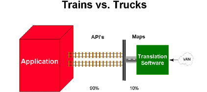 In a data processing environment, information (data) on ‘trucks’ can go anywhere in the system. New information only requires new instructions, and new messages. Information on ‘trains’ can only go where the programs (tracks) ‘say’ it can go. Thus, new destinations require new ‘tracks’ and the new programming, coding, compiling, and testing that comes with it. The concept is easy to understand when presented to scale. Messaging (trucks run on highways) takes about 10% of the ‘integration’ effort. API’s (trains), on the other hand, run on tracks (program code) which comprises about 90% or the ‘integration’ effort.