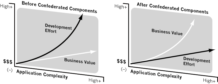 The confederated component approach allows developers to build applications one model at a time, yet the end result is a coherent Information System with no visible seams for the end user. With this approach, the application can be released in groups of components. Each component can function within the group, interact with existing components, and provide a new set of interaction capabilities for already existing components. The cost of creating components does not increase over time, since no extra work is required to create more links to components. With this model, the value of every new application increases exponentially. Specifically, it grows to the square of the number of components in the model (valued as the number of possible combinations the user can deploy). On the other hand, cost grows only linearly or sometimes declines as the developer becomes more expert in confederated component methodologies.