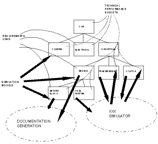 These building blocks can be used to build systems by attaching or linking them to each other. For example a car design might consist of many of these abstract building blocks built into the structure of a car (...the car consists of an engine, transmission, passenger compartment, etc.). The parts of the car are hooked to each other such as the engine is attached to the transmission and the transmission is linked to the drive train. Requirements are used to capture customer desires (the foundation upon which the product is built and the common language used to talk to the customer) and are related to the various car components that address those requirements. Budgets are attached to the various car components to track cost, MPG, weight and other critical design parameters. Notes are also attached to car components to document decisions, concerns, and many other issues involved in getting the car to market. With the design complete, documents are generated out of this design capture effort such as maintenance manuals, user manuals, software design specifications, and others.