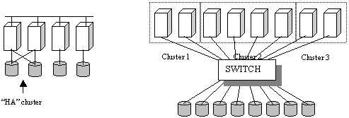 Redundancy is easily added to a SAN through the incorporation of a second switch or redundant switching components to support high availability data access. Additional nodes and disk arrays can be easily added to these configurations with minimal disruption by plugging new components into the switch, providing a much simpler and more scalable growth path than traditional architectures. Finally, multi-node SAN-based clusters offer a much more cost-effective and flexible approach for proactively managing availability at the application level: any node in the SAN may potentially back up any other node. One or two dedicated nodes can now backup a much greater number of nodes, thereby significantly reducing the hardware costs associated with cluster configurations.