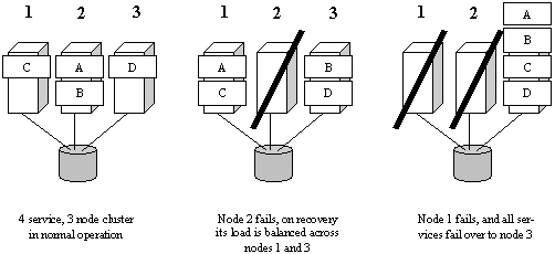 Figure 4. Automated recovery from multiple successive failures, demonstrating dynamic load balancing on failover and "cascading" failover, in a simple three node, shared disk cluster.