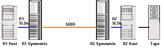 The SRDF configuration is primarily used for disaster-recovery purposes, but can also be used for point-in-time backup with OmniBack II. The first (primary, R1) Symmetrix is connected to the R1 Host running a production application or database. A set of R1 SLDs is SRDF-mirrored to a secondary (and possibly dislocated) R2 Symmetrix, which exports its R2 SLDs to a R2 Host. The R2 SLDs are read-only while the SRDF link is established, and the R2 Host is in a stand-by mode and used for running the OmniBack II backup process only.