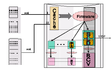 All data flow between the SCSI channels (through which the client host computers are connected to the ICDA) and the physical disks inside the ICDA is routed through the internal ICDA cache and controlled by the microcode. This allows the ICDA to implement the notion of logical devices (further: Symmetrix logical devices, SLDs) which are internally mapped to a whole or only a portion of a physical disk by the ICDA microcode and cache.