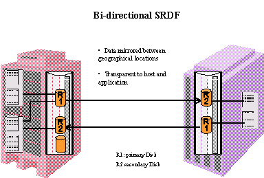 In an uni-directional configuration, selected SLDs in a designated primary (source) ICDA are mirrored to equivalent SLDs in the secondary (target) ICDA. The mirrors are maintained in a synchronized state by the SRDF protocol between the two Symmetrix ICDAs transparent and unknown to the host computer operating on the primary SLDs, and with very limited performance degradation. The two Symmetrix ICDAs can be physically dislocated the current ESCON implementation allows distances of up to 60km. However, connecting Symmetrix boxes using E-3 or T-3 lines, distances can be extended to any required extent.