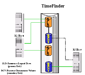 The Symmetric Multi-Mirror Facility (TimeFinder) is a business continuation process that creates an instant copy of a single or multiple Symmetrix logical devices, but inside a single Symmetrix ICDA. The instant copy is created on local SLDs called Business Continuation Volumes (BCVs) and is accessible to the host computer(s) via separate SCSI ports when it is detached from the original SLD.