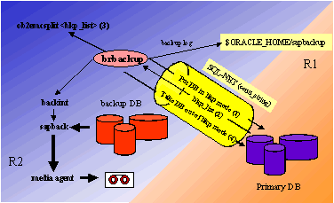 Brbackup takes over the control of the database and uses OmniBack II as a service to communicate with the Symmetrix and to perform the backup. The brbackup process actually running on the R2 Host queries the production database on the R1 host for the files/raw partitions the database is built on. This information is transferred to OmniBack II to perform the actual split. Like for the normal Datalist backup the BSM is now coordinating the tasks which needs to be performed.