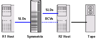R1 BCVs A set of SLDs residing in the R1 Symmetrix, and used for local detachable mirroring of the (production) R1 SLDs.
