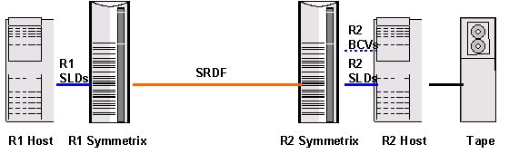 This solution assumes that a set of SLDs inside the R1 Symmetrix is SRDF-mirrored to a set of SLDs inside the R2 Symmetrix, which are then TimeFinder-mirrored to a third set of BCVs inside the R2 Symmetrix.