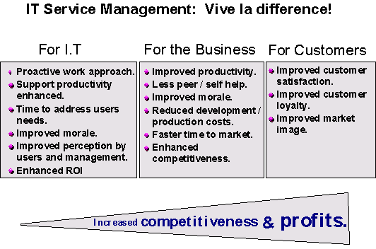 This example can also be turned around. An extra $100,000 invested in the IT organisation and effectively spent on improving IT Service Delivery will result in improved IT Service availability, end users better able to service their customers, improved customer satisfaction and an improved market image for the company. The increased retention rate for existing customers coupled with an improved ability to acquire new customers will provide benefits that exceed the initial expenditure. In addition the increased control which the IT Organisation has of the IT Services will result in less reactive support and allow more time to be focussed on proactively addressing the needs of the business with new and improved IT Services. This will result in additional competitive improvements.