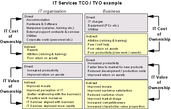 One mechanism for examining the financial dynamics of IT Service Delivery is to consider the Total Cost of Ownership and Total Value of Ownership of the IT Services which are delivered.