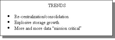 Several major trends are affecting the evolution of enterprise computing architectures. Shrinking budgets and the complexities associated with distributed management are encouraging a re-centralization of critical resources, including servers, storage and management personnel. The availability of ever larger servers (or nodes) and favorable cost factors, particularly in the purchase of storage hardware, are helping to make re-centralization economically feasible. Coupled with the normal growth of storage in a healthy business environment, this consolidation has resulted in an explosive growth of storage capacity that must be managed. This has put new demands on storage management vendors to provide better technologies to share and manage large centralized data stores. As MIS shops evolve to accommodate and leverage these trends, end users continue to clamor for high speed, ubiquitous access to applications and data.