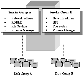 An application service is the service the end user perceives when accessing a particular network address. An application service is typically composed of multiple resources, some hardware and some software based, all cooperating together to produce a single service. For example, a database service may be composed of one or more logical network addresses (such as IP), RDBMS software, an underlying file system, a logical volume manager and a set of physical disks being managed by the volume manager. If this service, typically called a service group, needed to be migrated to another node for recovery purposes, all of its resources must migrate together to re-create the service on another node. A single large node may host any number of service groups, each providing a discrete service to networked clients who may or may not know that they physically reside on a single node.