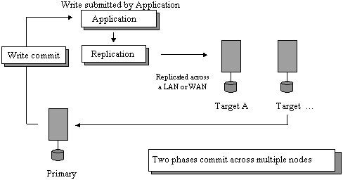 Certain applications or environments require that all servers or sites reflect a given update at exactly the same time. Inconsistent data states, no matter how small, may lead to various exposures and are deemed an unacceptable risk. In cases where this is the primary requirement, the two phase commit protocol used by the synchronous method ensures that a write is not reflected as committed until all participating servers have confirmed that it in fact is committed. There is typically a latency associated with the two phase commit protocol that can degrade application performance. For this reason, synchronous replication is most effectively utilized in application environments with low update rates that require all sites to reflect a common data state at all times. Synchronous replication can trade write performance for better data integrity.