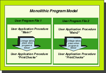 The "monolithic program model" depicted on the left side of