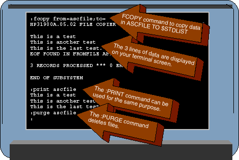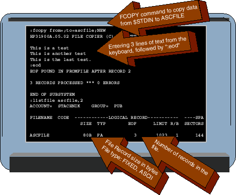 When you log on to an HP 3000, MPE/iX automatically assigns a filename to your session's input device. The filename used is $STDIN, and your session's input device is the terminal or PC that you're using to access the HP 3000. If you're logged on at a terminal, you can think of $STDIN as a name representing your terminal keyboard. Similarly the filename $STDLIST represents your terminal's display. You can use FCOPY to read data from $STDIN or to write data to $STDLIST. If you leave the FROM= or TO= parameters blank, FCOPY will default to $STDIN for the FROM= parameter or $STDLIST for the TO= parameter. For example, suppose you wanted to create a file called TEXTFILE and load it with a few lines of text. Here's an easy way to copy some text from your keyboard into a NEW file called TEXTFILE::FCOPY FROM=;TO=TEXTFILE;NEWThe NEW option tells FCOPY that the output file (TEXTFILE) hasn't yet been built. FCOPY will create the file for you. The FROM= parameter has been left blank, so it will read the data from $STDIN--that is, it will expect you to type the data at your keyboard. The way this works can be a little confusing if you haven't done it before. After you enter the FCOPY command, a banner will be displayed. Then the program will appear simply to stop. At this point, new users sometimes get confused and think that something has gone awry. But there's nothing wrong. FCOPY is waiting for you to type some data. It has posted a READ operation on $STDIN (your keyboard). But there is no prompt or any other indication that it's waiting for you to type something, hence the confusion. But from this point forward, anything that you type at your keyboard is treated as data. As far as FCOPY is concerned, your terminal is a file, and everything you type will be read by FCOPY (as if it were a record in an input file) and written to the output file (TEXTFILE). If you type MPE commands (:SHOWJOB, LISTFILE, :BYE, HELP), they will not be executed, because FCOPY now "owns" your $STDIN file. Every keystroke that you type is captured and sent directly to the output file (TEXTFILE). So now is the time to type the data that you want to load into the output file. Of course, sooner or later you'll need to get FCOPY to turn your $STDIN file loose so you can start typing MPE commands again. Let's see how that's done. When FCOPY is reading data from a disk file, it works its way through the data until it reaches the end of the file. Reaching the end of a file triggers an end-of-data condition that tells FCOPY to finish copying the data that it has read to the output file, close all its files, and terminate. But $STDIN is not a disk file. Instead it's associated with your terminal. There isn't an "end-of-file" as long as you keep typing. If you stop typing, FCOPY will simply wait until you start again. How do you tell it that you're done? When FCOPY is reading from $STDIN, you can trigger the end-of-data condition by typing the character string :EOD. (Note that the first character in this string is a colon (":"). Figure 2 shows an example of using FCOPY with $STDIN. The FCOPY command is entered at the top of the figure. The parameter "FROM=;" specifies that data will be read from $STDIN. The parameter "TO=ASCFILE" specifies that the data will be written to a file called ASCFILE. And finally, the ;NEW parameter tells FCOPY that ASCFILE doesn't exist yet, and so FCOPY will create it. After FCOPY displays its banner, we type three lines of text, and then the string ":eod" to tell FCOPY that we are done. FCOPY terminates, and Figure 2 shows that we next use the :LISTFILE command to display the attributes of the output file, ASCFILE.Figure 2: Using FCOPY with $STDINUsing FCOPY with $STDLIST