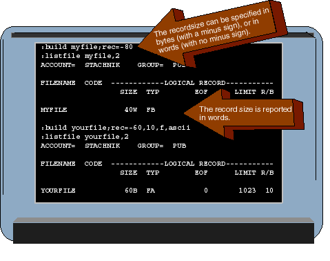 Let's finish up this month's article by looking at how you specify all these file characteristics in a :BUILD command. They are all specified as part of the ;REC= parameter. The keyword "REC=" can be followed by up to four positional parameters. Positional parameters are separated by commas, and must be specified in a particular order. The full syntax of the REC= parameter is as follows:REC= record-size,blocking-factor, record-format,file-typeThe bottom of Figure 4 shows an example of a :BUILD command in which all of these parameters have been specified. The REC parameter has been specified as follows:rec=-60,10,f,asciiLet's look at the four positional parameters one at a time. Remember that they must be specified in the order shown above: the record size followed by the blocking factor, followed by the record format, followed by the file type.